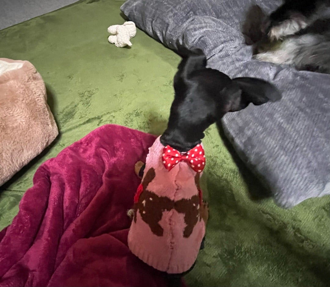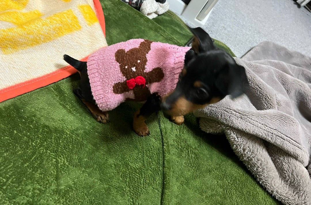 みーちゃんがあまりに寒そうなので、カニちゃん昔飼ってたコッカーの耳当てを改造して服を作ってみた^_^
