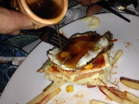 パンケーキに、目玉焼き蜂蜜がけ