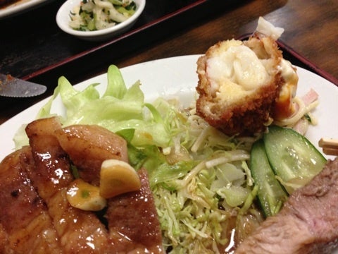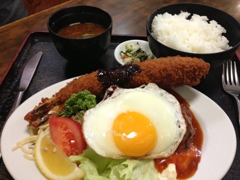 デッカいエビフライに卵のしたに隠れたハンバーグ