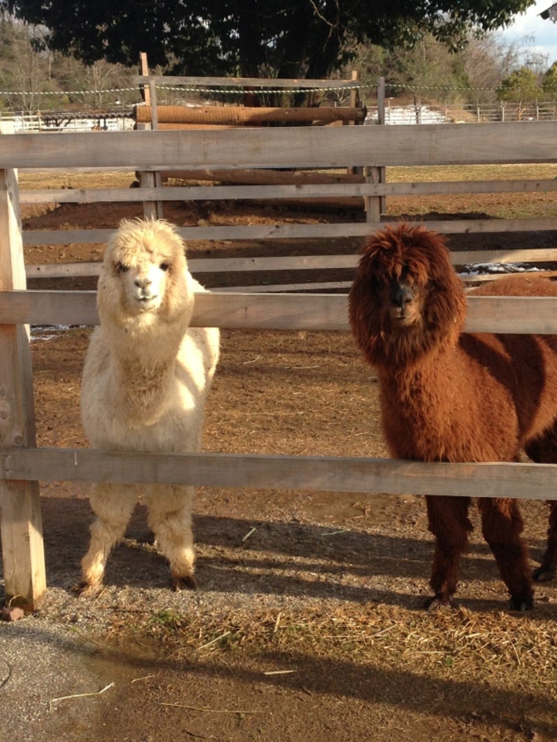 アルパカがいたいた(⌒▽⌒)二匹子供みたいで、めっちゃなつくけど、近くに行くと唾をはきそうなので😱😱😱😱